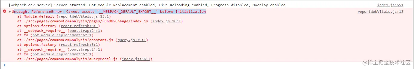 报错 Uncaught ReferenceError: Cannot access '__WEBPACK_DEFAULT_ 晨楠 2022-09-06 340 阅读1分钟 今日发现了一个报错,通过搜索有人说是因为引入的包用了ts,但webpack中并没有配置ts-loader 但其实不是,新版本的babel已经集成了ts-loader的功能,不需要单独去配置ts-loader了 后经排查,发现是当前打包文件的其他导入包,间接又引入了当前的文件,导致发生了循环引用导致,手动拆解了依赖关系解决了此问题