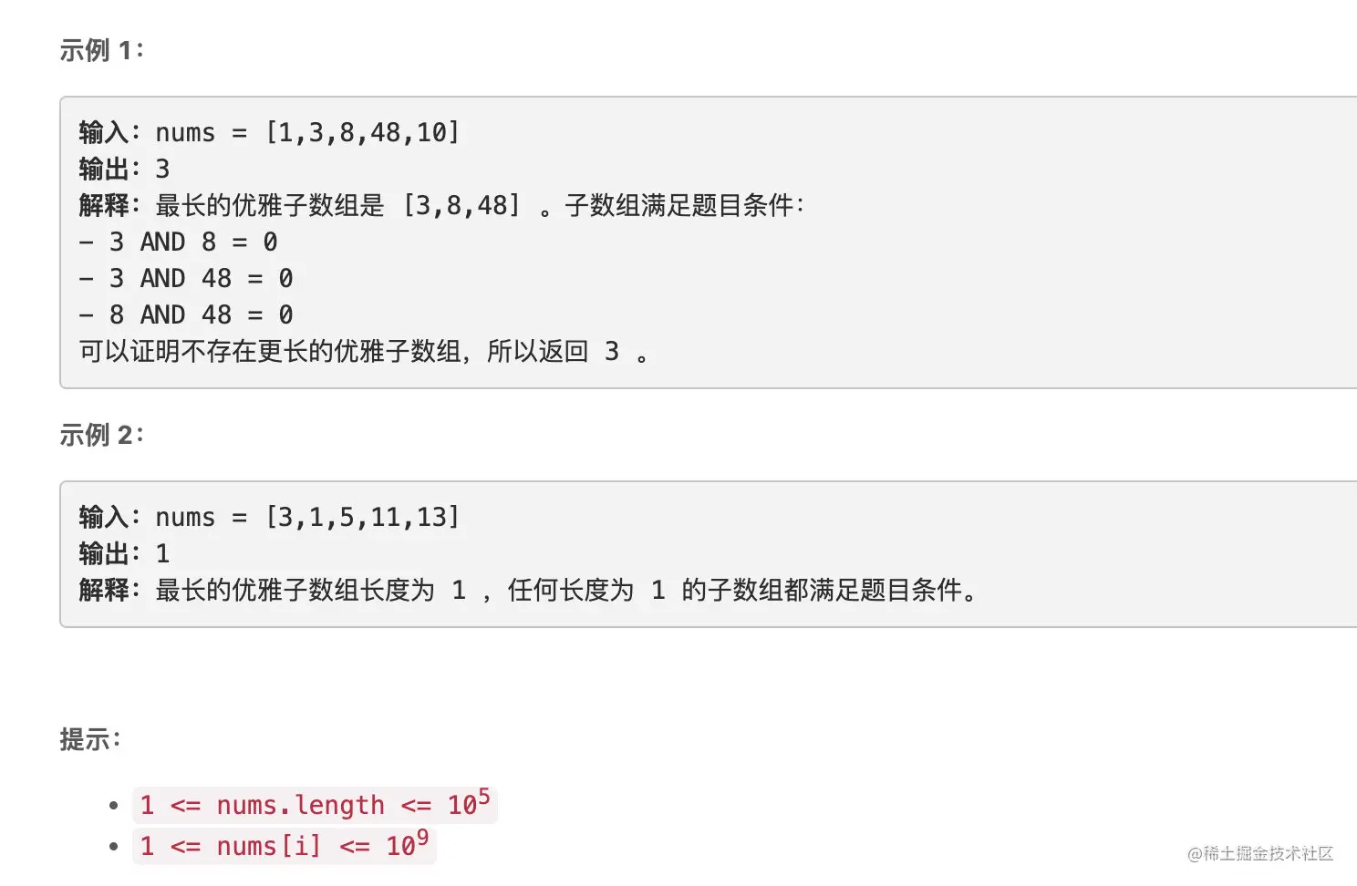 如果 nums 的子数组中位于 不同 位置的每对元素按位 **与(AND)**运算的结果等于 0 ,则称该子数组为 优雅 子数组。