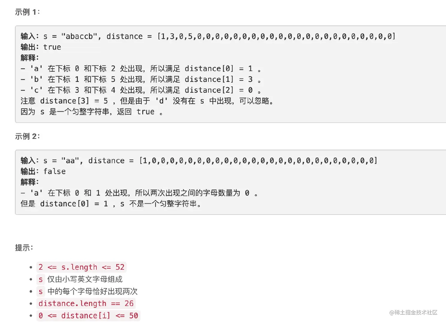 在一个 匀整 字符串中,第 i 个字母的两次出现之间的字母数量是 distance[i] 。如果第 i 个字母没有在 s 中出现,那么 distance[i] 可以 忽略 。
