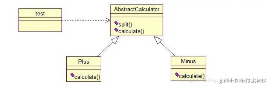 就是在AbstractCalculator 类中定义一个主方法calculate,calculate()调用spilt()等,Plus 和Minus 分