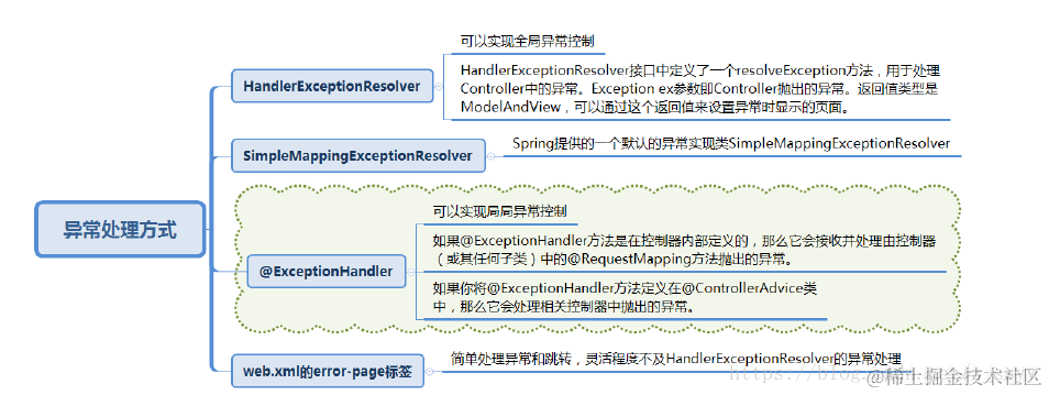 Spring的处理器异常解析器HandlerExceptionResolver接口的实现负责处理各类控制器执行过程中出现的异常。也是上面提到的,是DispatcherServlet中的特殊bean,可以自定义配置处理。某种程度上讲,HandlerExceptionResolver与你在web应用描述符web.xml文件中能定义的异常映射(exception mapping)很相像,不过它比后者提供了更灵活的方式。比如它能提供异常被抛出时正在执行的是哪个处理器这样的信息。HandlerExceptionResolver 提供resolveException接口