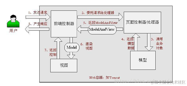 (4)(5)调用业务处理和返回结果:Controller调用业务逻辑处理后,返回ModelAndView。