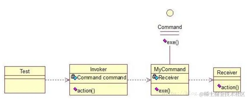 Invoker 是调用者(司令员),Receiver 是被调用者(士兵),MyCommand 是命令,实现了Command 接口,持有接收对象,看实现代码: