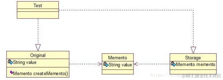 Original 类是原始类,里面有需要保存的属性value 及创建一个备忘录类,用来保存value 值。Memento类是备忘录类,Storage 类是存储备忘录的类,持有Memento 类的实例,该模式很好理解。直接看源码: