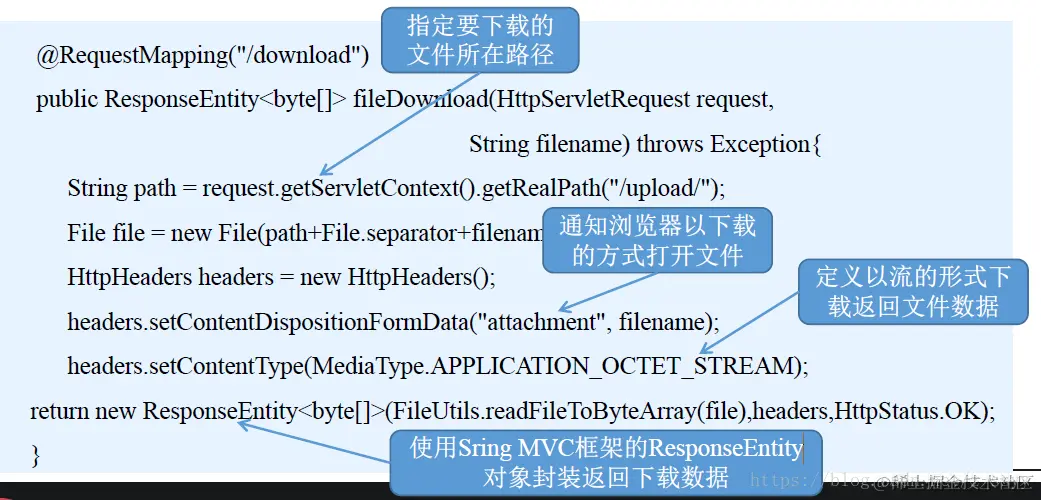 (2)在后台使用Spring MVC提供的ResponseEntity类型对象完成文件下载,使用它可以很方便的定义返回的HttpHeaders对象和HttpStatus对象,通过对这两个对象的设置,即可完成下载文件时所需的配置信息