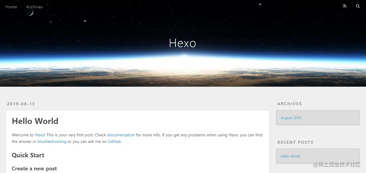 本地的网站配置也就完成了,输入hexo g(或者hexo generate) 生成静态网页,然后输入 hexo s(或者hexo server) 启动本地服务器,然后浏览器输入http://localhost:4000 ,就可以看到我们的博客啦,效果如下: