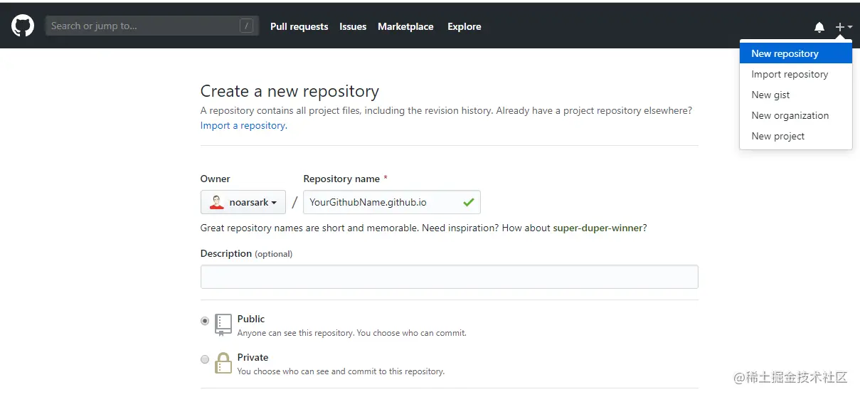 这样,博客在本地就搭建完成了,现在要将其部署到远程仓库,这样其他人才能访问到我们的博客。首先需要注册 Github 账号,然后新建一个仓库,如下图所示,其中 YourGithubName 是 Github 的用户名。