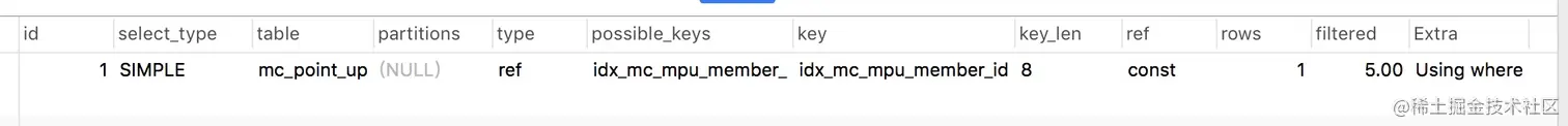 | extra | 展示的是额外信息 | Using index:使用覆盖索引;Using where:使用 where 语句来处理结果,查询的列未被索引覆盖;Using index condition:查询的列不完全被索引覆盖,where条件中是一个前导列的范围;Using temporary:mysql需要创建一张临时表来处理查询。出现这种情况一般是要进行优化的,首先是想到用索引来优化。****Using filesort:将用外部排序而不是索引排序,数据较小时从内存排序,否则需要在磁盘完成排序。这种情况下一般也是要考虑使用索引来优化的。****Select tables optimized away:使用某些聚合函数(比如 max、min)来访问存在索引)的某个字段是****backward index scan关键字,译为中文就是倒叙索引范围查找 |