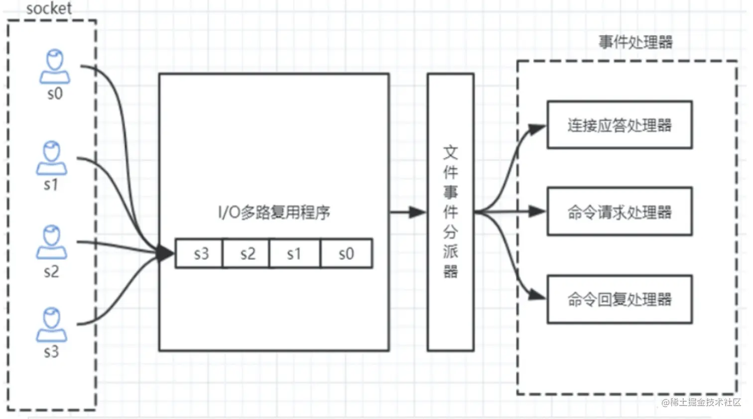 Redis的IO多路复用:Redis利用epoll来实现IO多路复用,将连接信息和事件放到队列中,依次放到文件事件分派器,事件分派器将事件分发给事件处理器。
