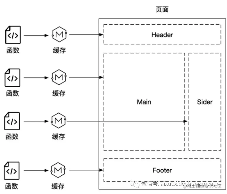 这种按函数来返回页面的方式,可以更灵活地实现组装。我们可以将页面切分为多个区域,每个区域由特定的函数生成。当用户打开页面时,可以优先请求并加载某一区域的页面代码。同时,这些不同区域的模块可以灵活地复用到不同的页面中,也可以根据不同的更新频率来缓存这些区域,从而进一步提高服务的性能。