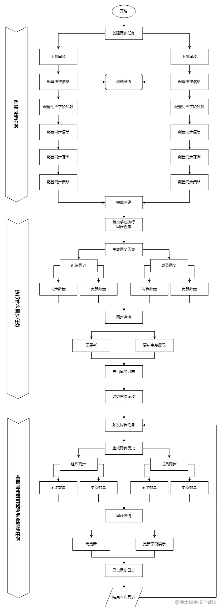 通过上游系统,即从飞书、北森、Moka 等系统中获取组织和员工用户信息,存储到 Authing,通过 Authing 将组织和用户的信息数据同步到系统中,具体业务流程如下: