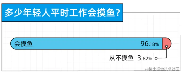 根据 36 氪《2022 职场摸鱼报告》显示,96.18% 职场人上班会摸鱼,从不摸鱼的员工仅占 3.82%。不是在摸鱼,就是在摸鱼的路上。