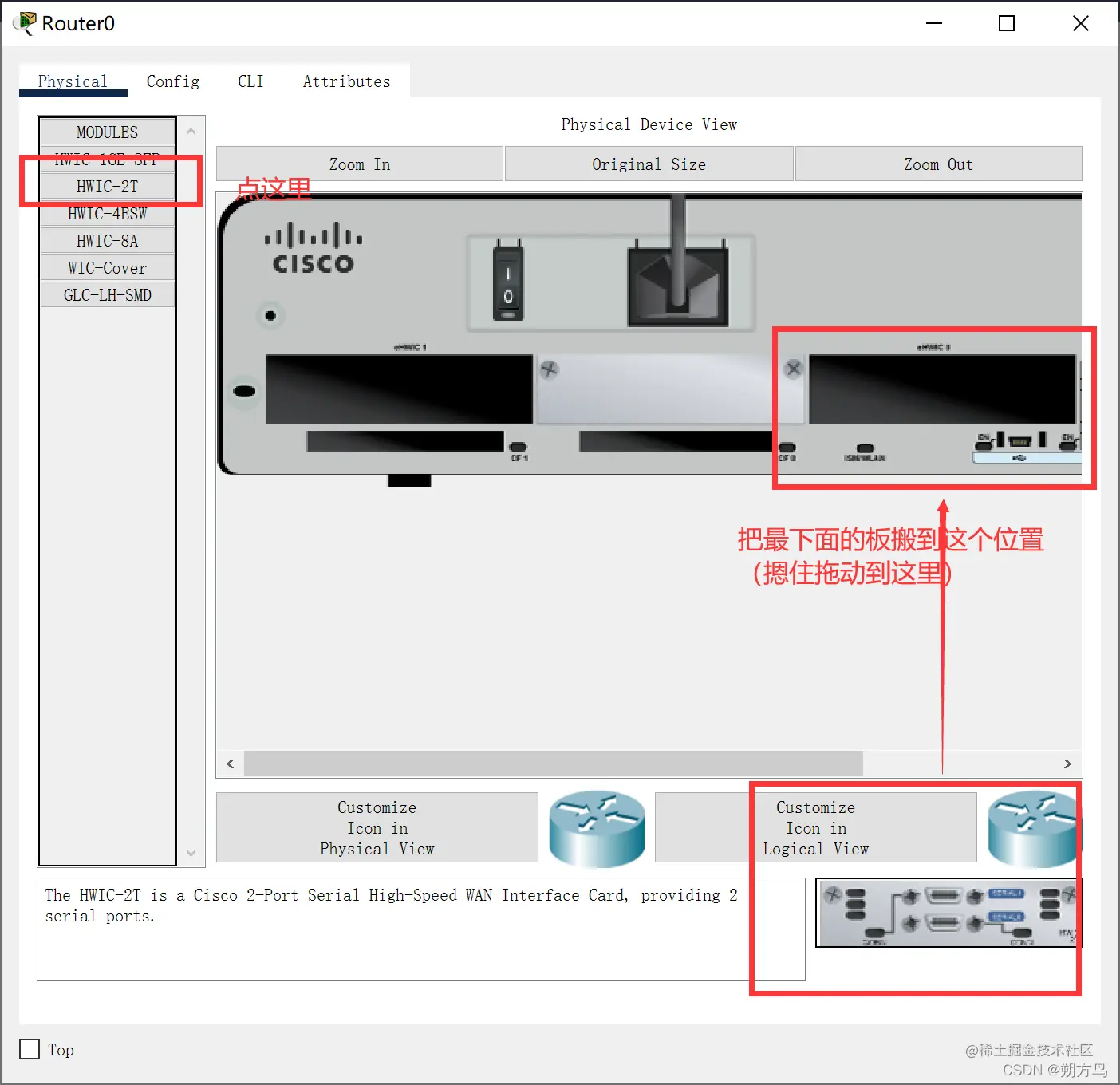 在配置拓扑图时,由于路由器上默认没有相应的Serial接口,需要通过加板槽的方式添加,操作如下: