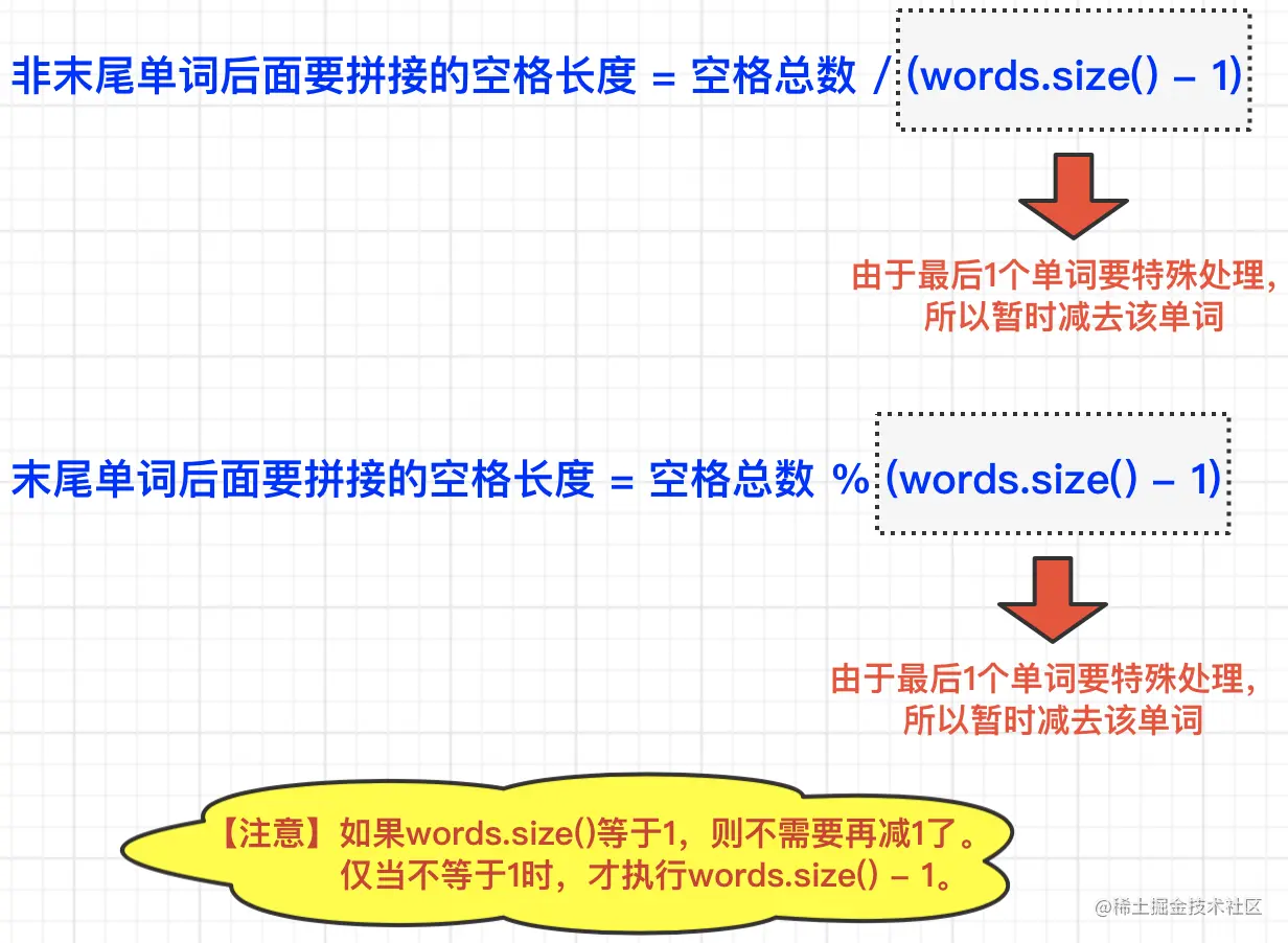 那么统计完空格个数和单子之后,就需要确定分隔每个单词的空格数目了。如上图所示,“i”、“love”、“you”这3个单词,如果有6个空格,是要在“i”和“love”后面分别添加3个空格的;但是,如果空格数是7个,那么就多余出了1个空格,那么就放到了“you”这个单词的后面了。所以,我们需要确定两个公式:非末尾单词后面要拼接的空格长度和末尾单词后面要拼接的空格长度。
