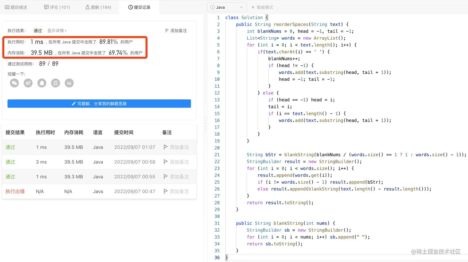 【解释】总共有 7 个空格和 3 个单词。7 / (3-1) = 3 个空格加上 1 个多余的空格。多余的空格需要放在字符串的末尾。
