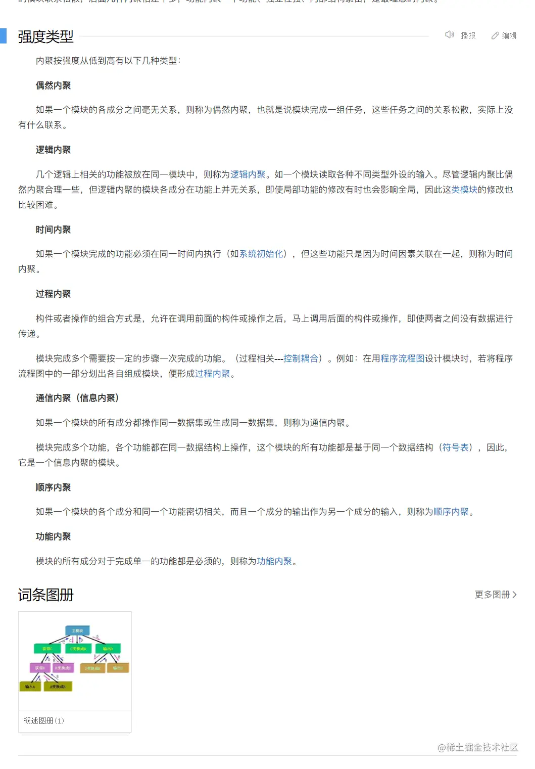 模块内部的元素, 关联性越强, 则内聚越高, 模块单一性更强。