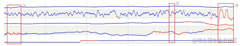 人观察这段数据后,发现的异常如上图,各段原因如下:
