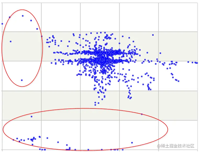 图中横纵坐标分别是两个仪表的数值。这样就一目了然了,两个仪表的数据多数都聚集在一起,只有少数分散在边缘。根据我们的判断标准——没出现或者不常出现的情况是异常,就可以判定图中红圈中的数据为异常。然后,只要利用数学方法把这些散点找出来并算出他们的异常度即可。