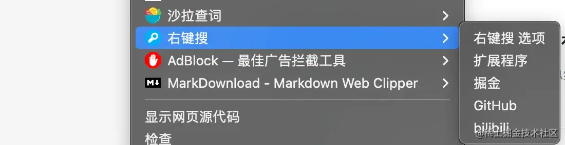 github,掘金等链接添加到这个右键菜单中,这样就不用我去地址栏查找或书签栏翻阅就可以直接跳转。