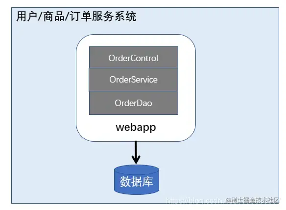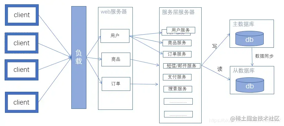 那么怎么办呢,我们将原本单台部署,单台处理的服务,需要进行拆分以及部署到不同的服务器中去,使其用多台机器去处理,分担压力。但是我们又要保证系统的完整性。这就是分布式的设计。接下来我们看下服务架构的演进史。