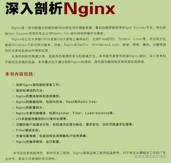 - 稍微详细一点展开的话,就是nginx的特殊进程模型和事件模型的设计。