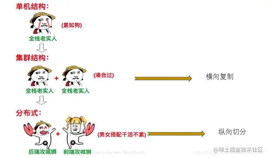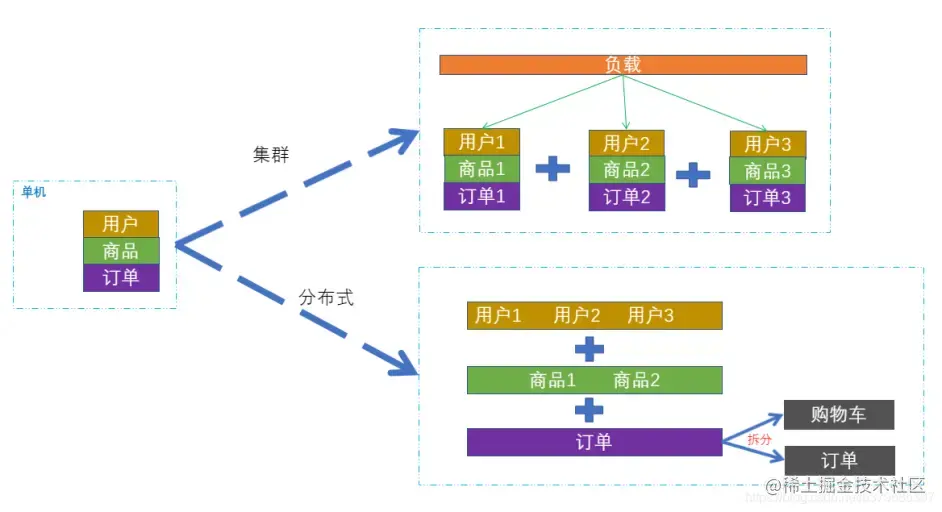 分布式:纵向拆分,一个业务分拆多个子业务,部署在不同的服务器上。主要是业务层面拆分,进行业务解耦,从而提高服务高可用以及高性能。 集群:横向复制,同一个业务,部署在多个服务器上,前面通过负载均衡,起到分担压力的作用。而且这些服务器中,即使有一两个宕机也不会影响到整体业务。