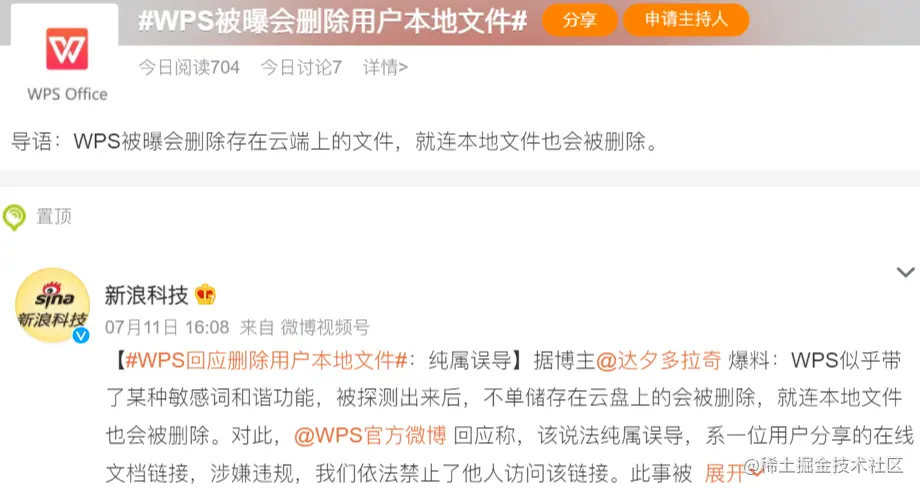 7月11日,WPS以#WPS被曝会删除用户本地文件#的话题上微博热搜了,还是第一的位置。作为做产品的老用户当然懂得其中门道:WPS不可能做这种事情,也不屑于做这种事情。金山办公CEO章庆元在接受媒体采访时表示“没做错。”这一回应也证实了这点。