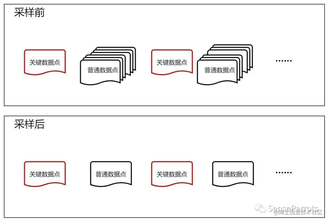 随机采样的核心实现思路是找到并保留关键数据点,采用一定的规则对普通数据点进行采样处理。关键数据点可以通过极值和首尾来判定,普通数据点的采样则可以按照固定的区间间隔取值。