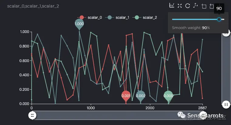 该方案的问题在于数据量过大(如十万级别)时渲染性能不佳,特征点不易发现。针对该问题,我们实现了平滑度的功能,通过调整平滑度,在保留特征点的前提下过滤不影响曲线走势的点,保留目标个数的数据点。这样可以提升渲染性能,方便更好地观察训练曲线走势和特征点。