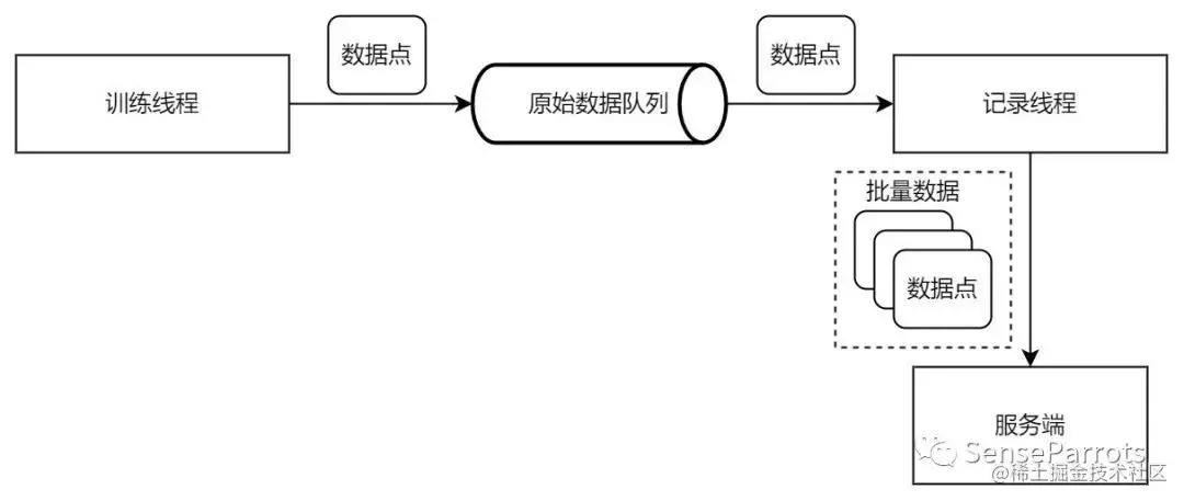 数据点在训练过程中是源源不断产生的。记录线程从数据队列拿到单独的数据点之后可以不停地向服务端同步数据,服务端则可以获得训练端实时数据,对数据进行存储,或者提供给数据使用者进行可视化展示。