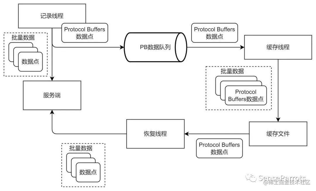 为了避免这个问题,我们可以同时引入另一个队列和缓存线程来实现本地缓存特性,保障训练过程中的数据会同时在本地文件上进行备份,借助 Protocol Buffers 协议进行编码来提高缓存文件的序列化读写性能,批量刷写数据到缓存文件来降低本地文件 IO 的性能损耗。在服务端恢复可用时,本地缓存的文件还可以使用恢复线程批量上传到服务端进行存储。