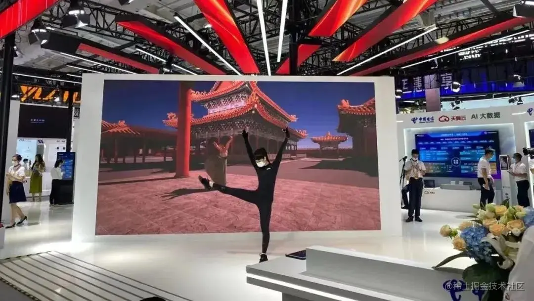 现场的虚拟数字人正在翩翩起舞,吸引了游客的目光。云游元宇宙紫禁城太和殿、沉浸式参观电信博物馆、亲身感受超高效率的