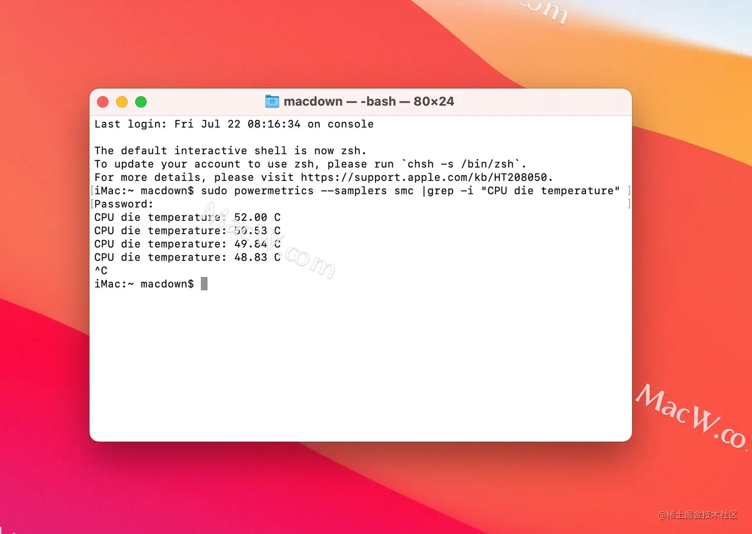 当出现提示时,输入您的管理密码。这将提供CPU温度的连续温度读数。按Control+C停止监视。