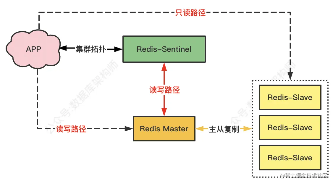 下面是另外一种Redis架构,访问路径又有不同,那么排查的方向也不会不同。