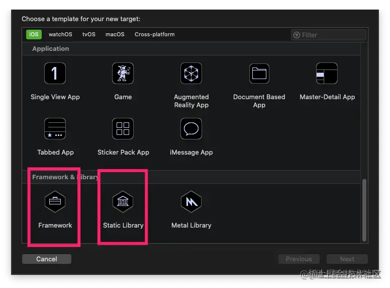 我们分别可以通过上面图中红色区域创建.framework和.a。我们知道区分是静态库还是动态库最终是我们选择的 Mach-O 的类型到底是Dynamic Library还是Static Library。