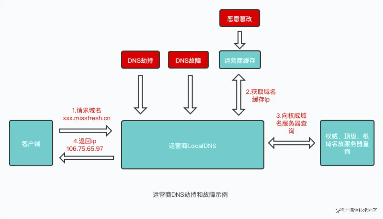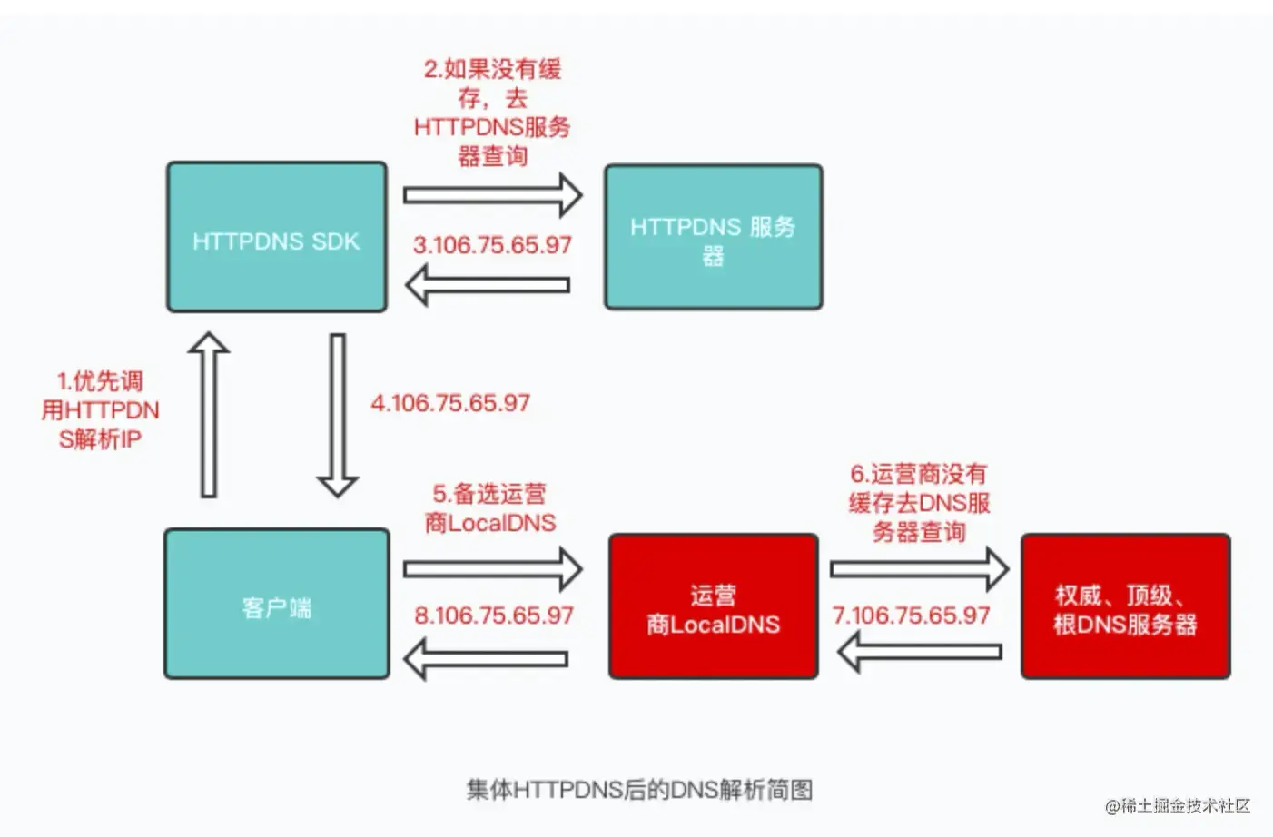 App内用域名发送请求都要经过DNS解析出ip,然后再根据ip去拿对应的资源,这个过程中,如果LocalDNS中存在这个域名对应的ip,就会直接返回这个ip,类似于App内做缓存。如果不存在,才会去权威DNS查询改访问哪个ip,然后查询到的ip会在LocalDNS中做缓存。