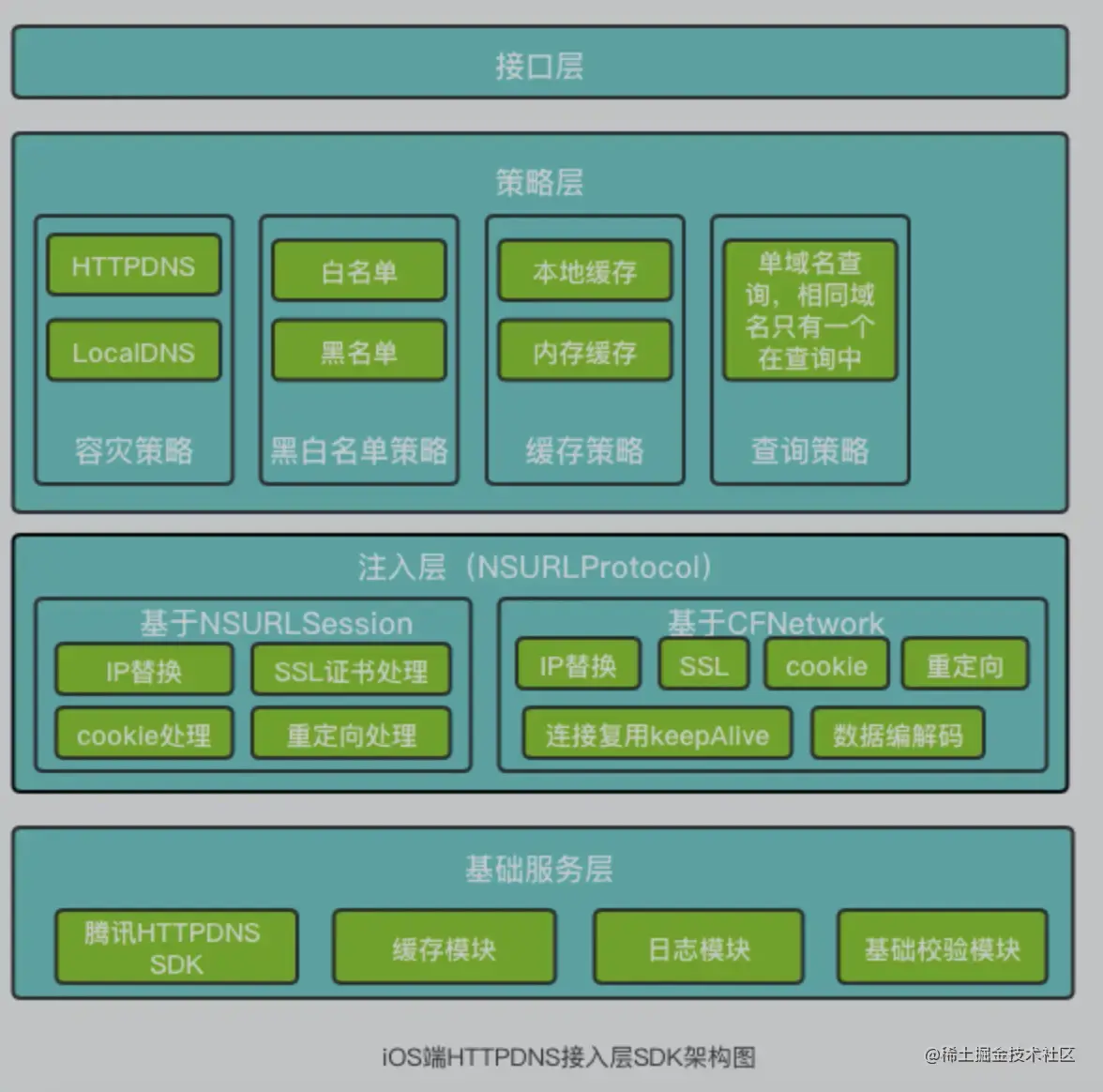 - 缓存策略:缓存策略除了基础服务层中腾讯云HTTPDNS SDK提供的基于TTL的缓存策略外,我们自己封装的接入层SDK中还存在一份内存缓存和本地化持久缓存,持久化缓存主要用来解决启动APP时无法获取HTTPDNS中的IP的问题,内存缓存主要为查询策略提供服务。当某个基于HTTPDNS的IP地址导致请求失败后,会清除当前域名和IP的缓存数据。同时外部可控制是否使用缓存。