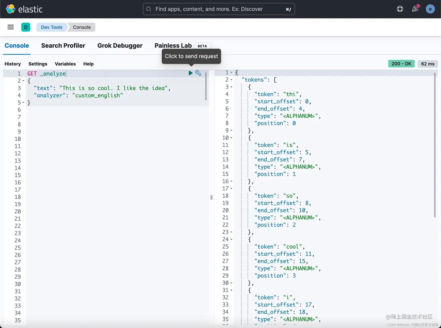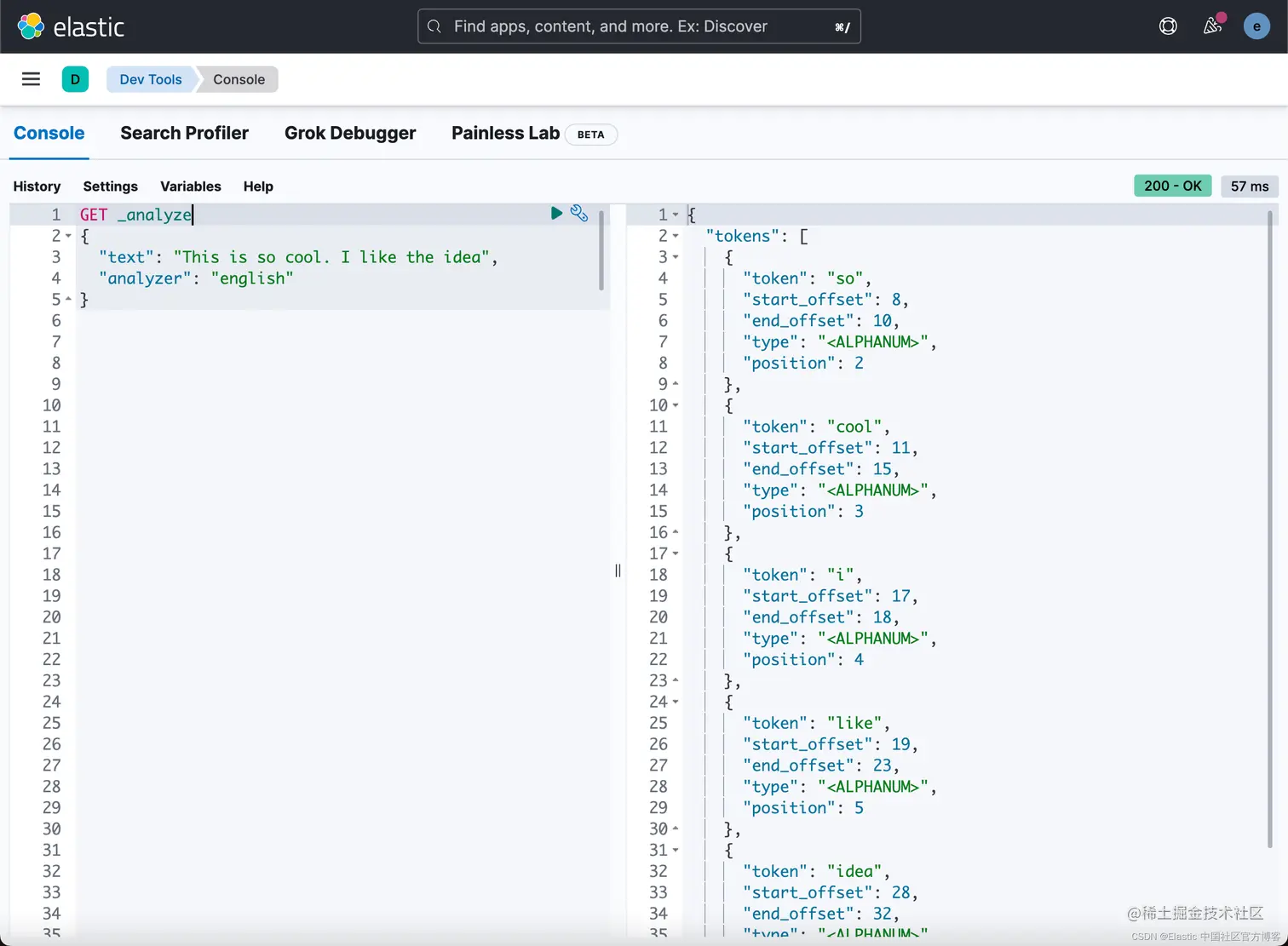 在上面,我们使用了 english 分词器。它将返回上面的结果。从上面我们可以看出来,this, is, the 都是 stop words。它们都不在返回的 token 之列。