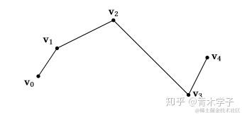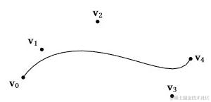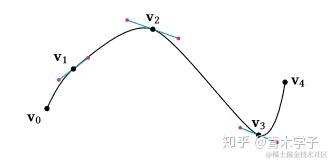 vi处的切线,红色的点就是三次Bézier曲线的控制点,分别处于切线对等的两侧。对于两个端点v0和v4,直接将这两个向量的控制点取为它们本身(这不是唯一的做法),最终得到一个平滑的曲线。