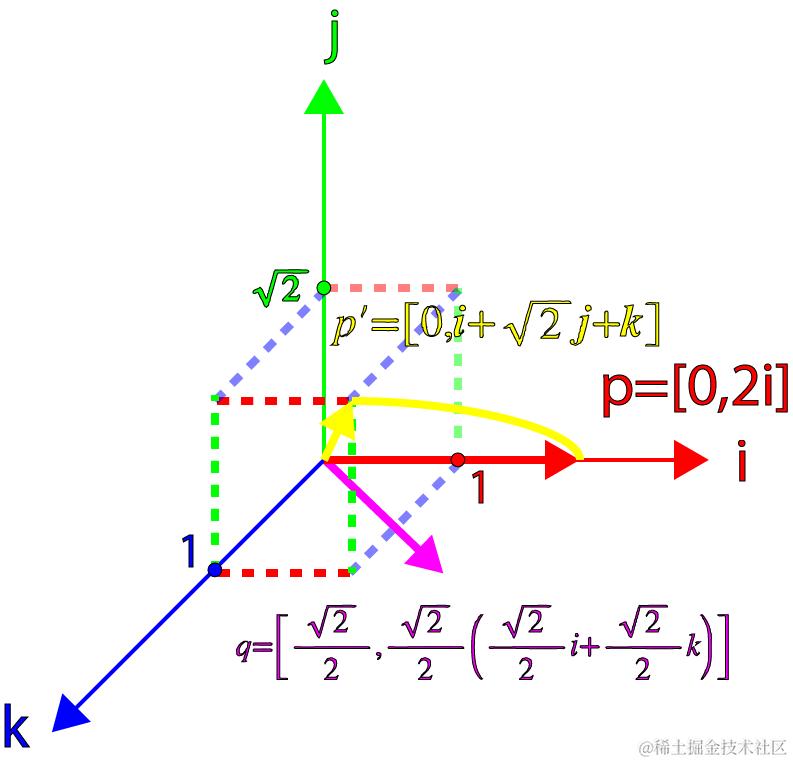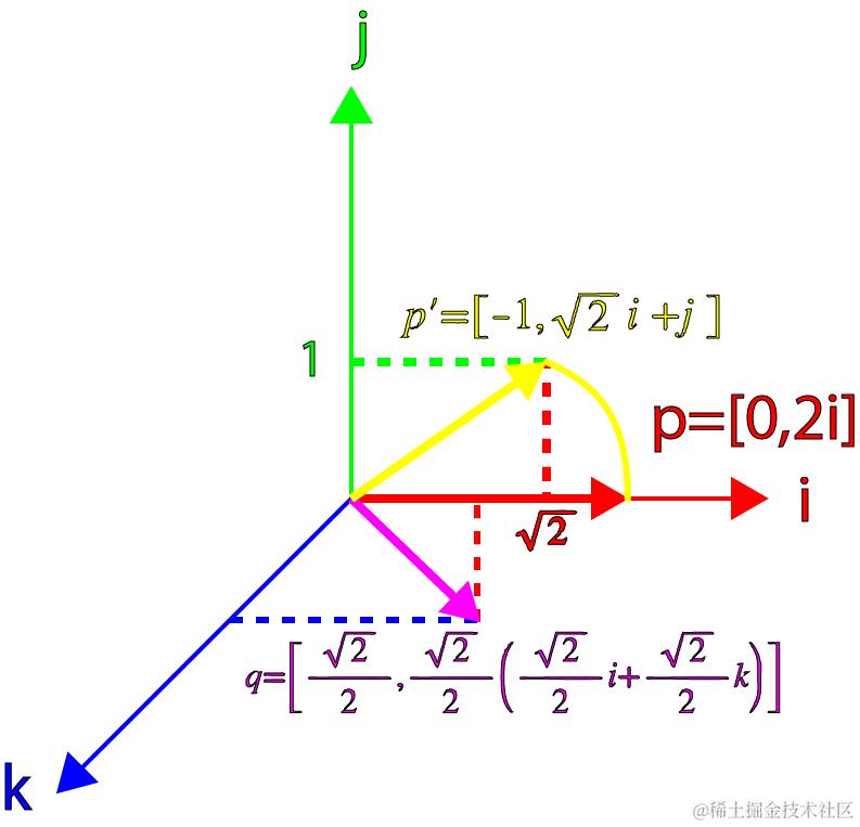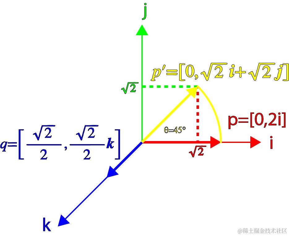 如果p′=pq,那么结果是[0,2i+2i×k]=[0,2i−2j],旋转的方向也就改变了。