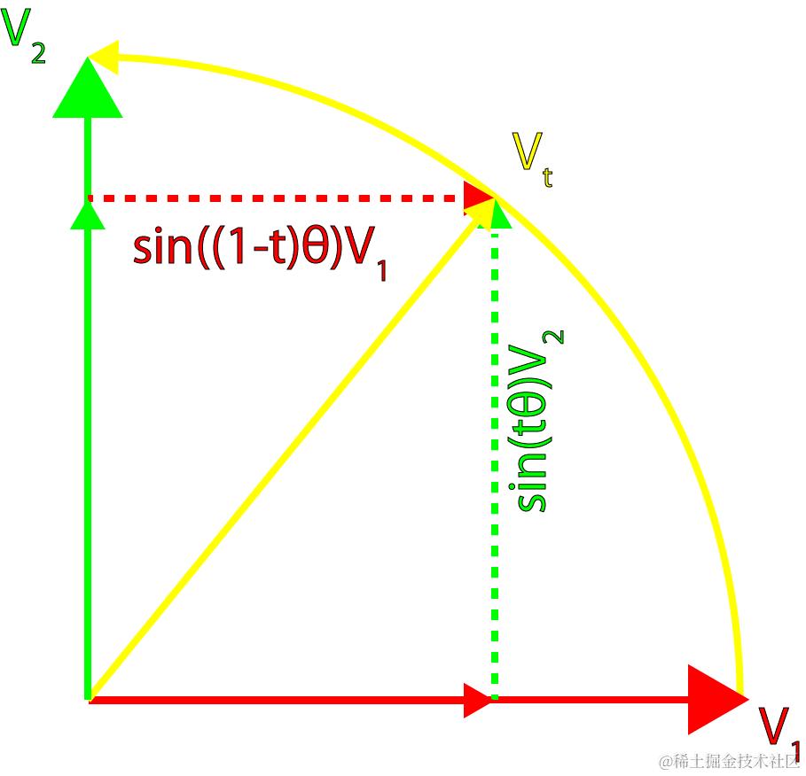 vt=sinθsin((1−t)θ)v1+sinθsin(tθ)v2