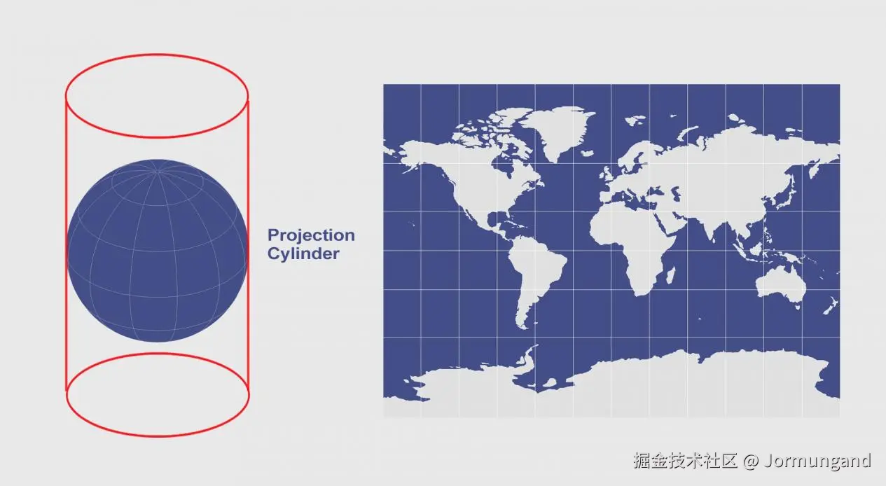圆柱投影是一种将地球表面投影到一个圆柱体上,然后将圆柱体展开成平面的一种地图投影方法。根据圆柱体与地球的相对位置(如相切、相割)和投影特性的不同,圆柱投影可以分为多种类型,其中航海、航空等领域广泛应用的墨卡托投影就是其中的一种。