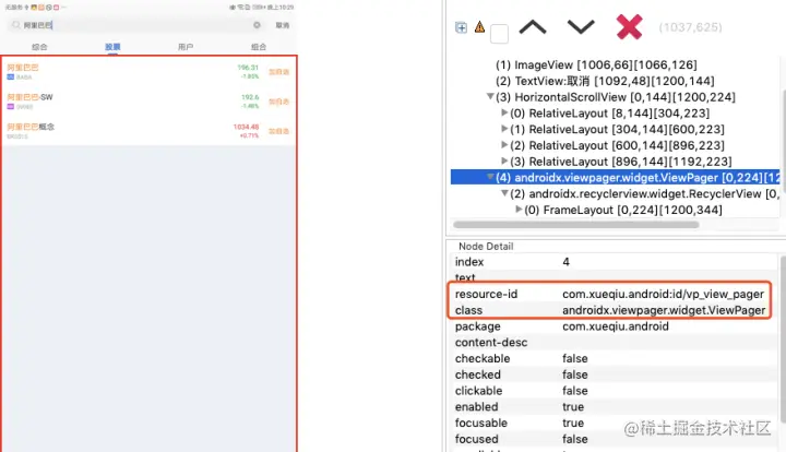 2)接着我们就必须从 tag 页内部来找标志控件了,我们发现在“股票”和“用户”页中搜索出来的结果名称的 id 是不同的: