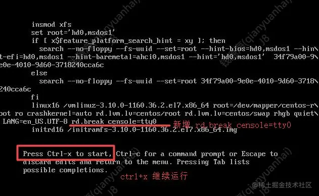 编辑修改:方向键一直往下按,在以linux16开头行末尾 加入 rd.break console=tty0 ,ctrl x 继续运行\