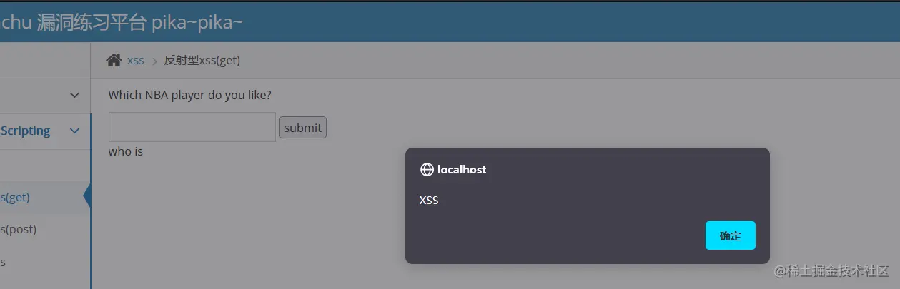 url:http://localhost/pikachu/vul/xss/xss_reflected_get.php?message=%3Cscript%3Ealert%28%22XSS%22%29%3C%2Fscript%3E&submit=submit