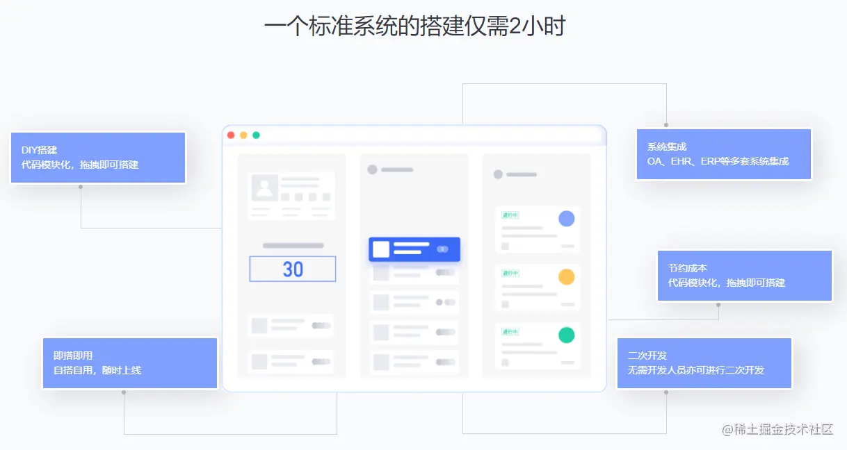 连起来就是:通过数据模型/建模、图形界面拖放组件可以加快应用开发,减轻了非技术开发人员的压力。