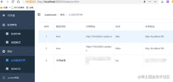 完成隧道信息填写后,就可以保存隧道设置,生成对应的数据隧道。接着我们回到“状态”项下的“在线隧道列表”页面,复制该本地网页的公网地址(即数据隧道的入口)进行访问。