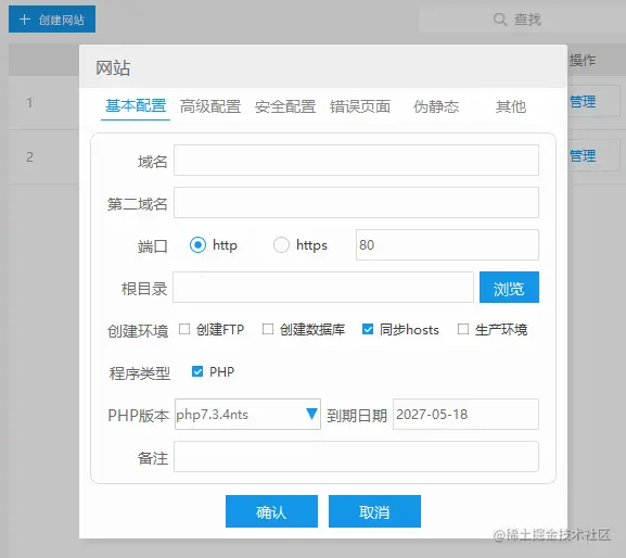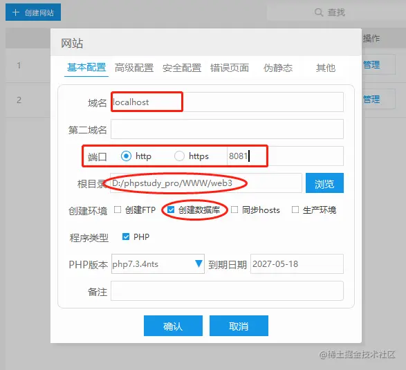 接着,我们回到软件主界面,点击“网站”项,建立一个能供WordPress网页运行的“壳”,并指定这个“壳”的输出端口。