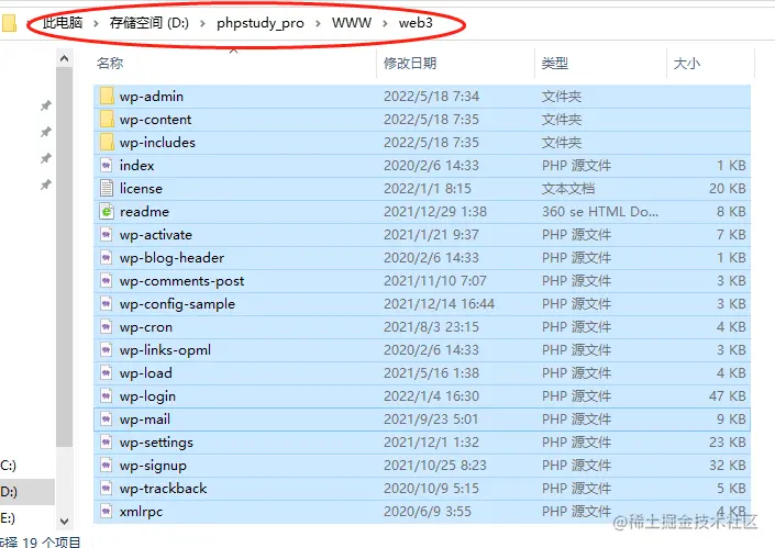 第二步,在网站运行环境搭建完成后,我们就能进入网站本身的搭建。这里我们使用WordPress建立网站。由于WordPress是一个网站套件,因此不能直接双击安装,需要将WordPress的压缩包文件,解压至PHPStudy建立的“壳”网站文件夹中。