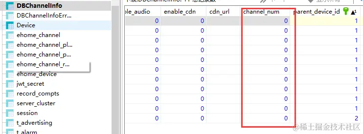 4、最终通过上面的数据库字段发现,查找DBChannelInfo这个表中“channel_num”有多个相同的值,所以找出的“channel_num”是错误的,获取的客流量也是错误的。